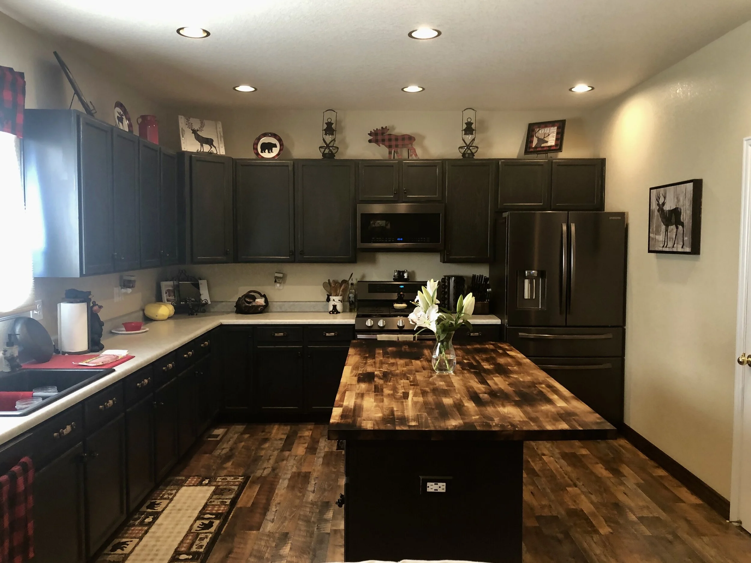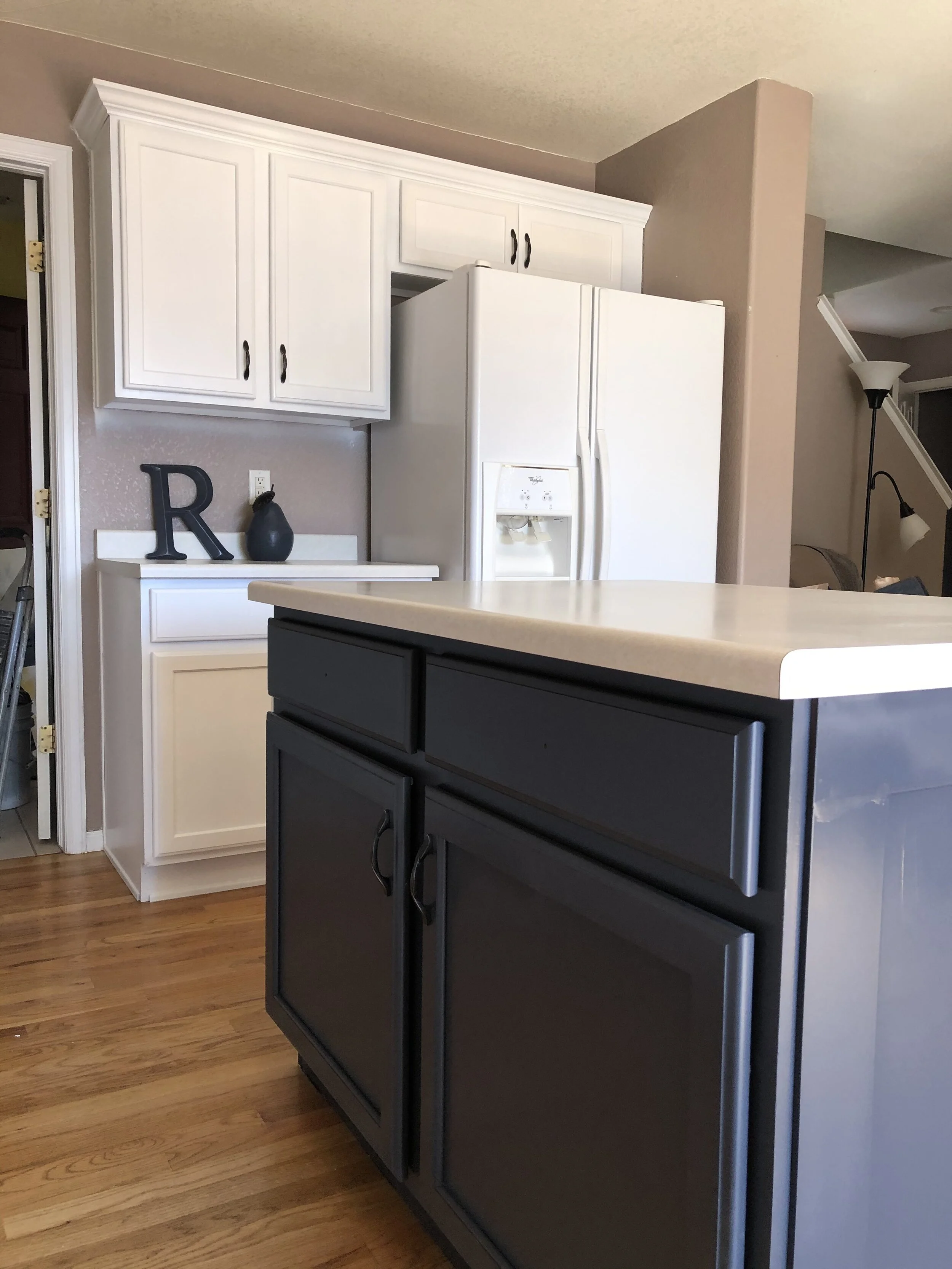 This custom kitchen needed a facelift and we can’t wait to see it with new countertops and back splash, we painted this one Chantilly Lace